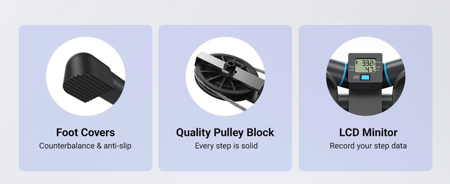 【 330LBS High Weight Capacity 】 Crafted from premium materials such as thickened steel and steel cables, our stepper can support up to 330lbs. Its robust construction guarantees stability and safety, even during rigorous exercise sessions.