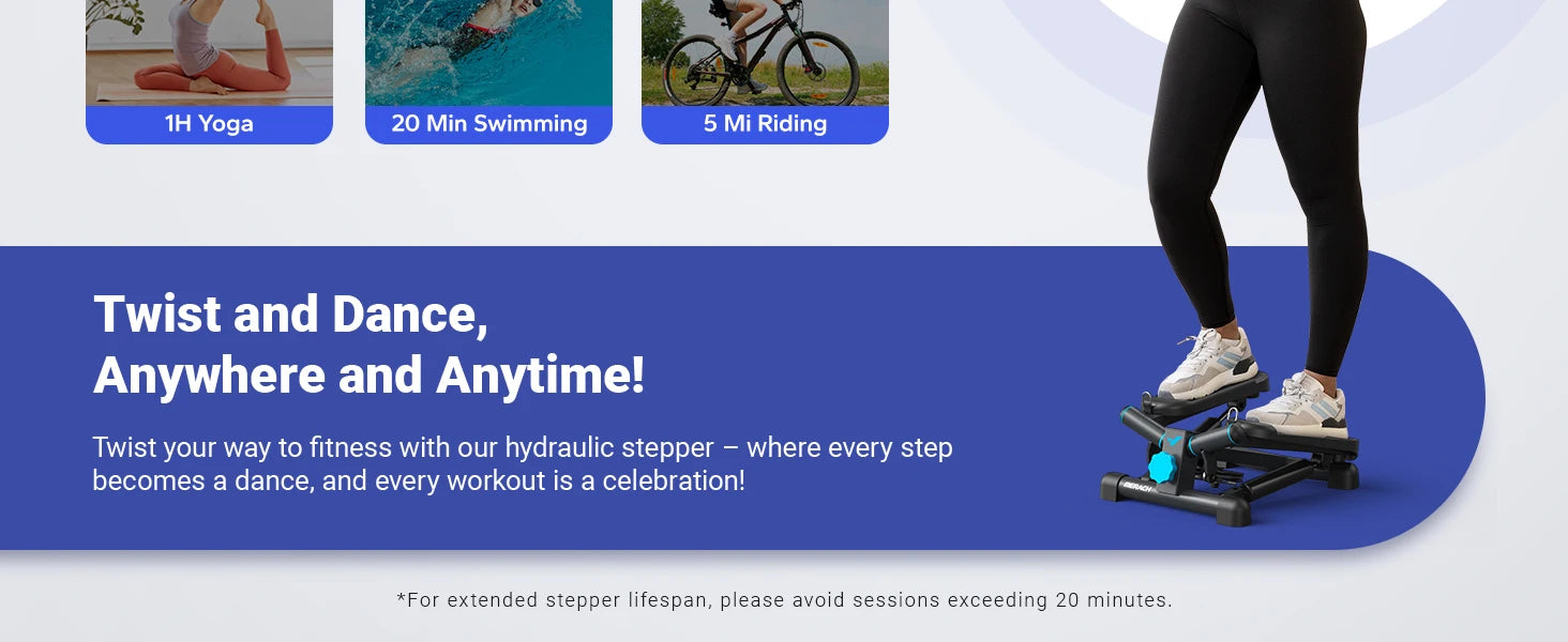 【 Twist Design for Full-Body Fat Burning 】 The innovative twist motion design of our mini stepper engages multiple muscle groups, resulting in efficient full-body fat burning. With each twist, you're not just exercising; you're dancing your way to fitness, making the most of every minute spent on your wellness journey.